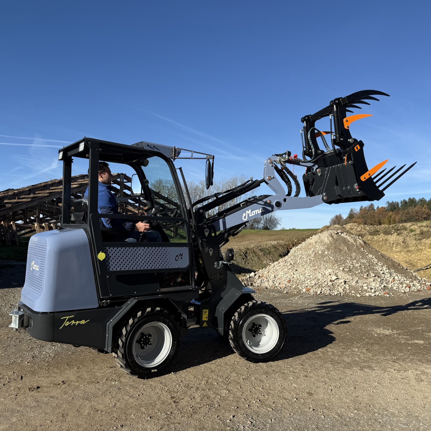 La puissante chargeuse compacte MONA Terra à quatre roues motrices est alimentée par une batterie LiFePO de 460 Ah (22 kWh).
