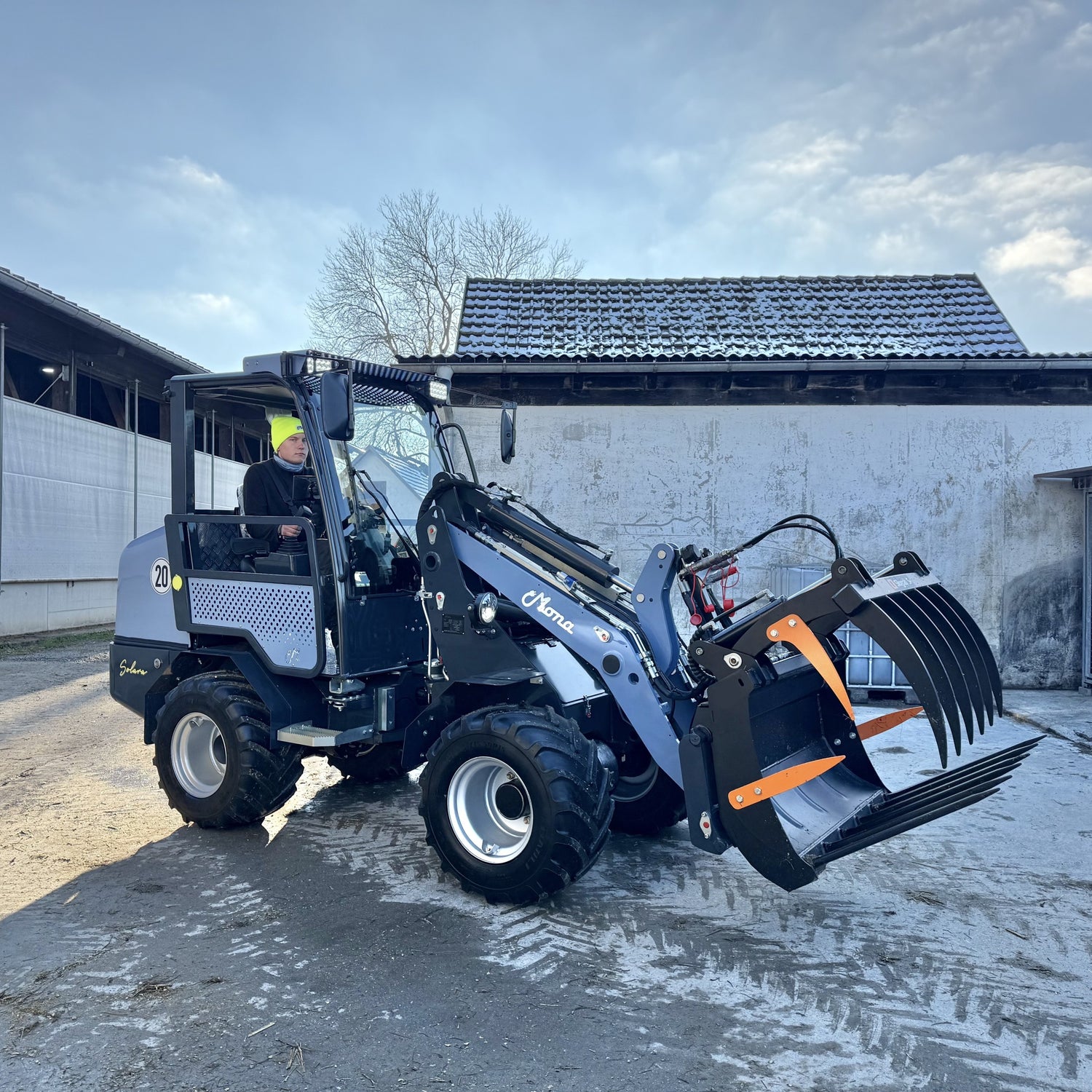 La chargeuse sur pneus électrique MONA Solara peut être configurée et commandée en option avec des pneus industriels, des pneus agricoles larges ou des pneus pour pelouse .