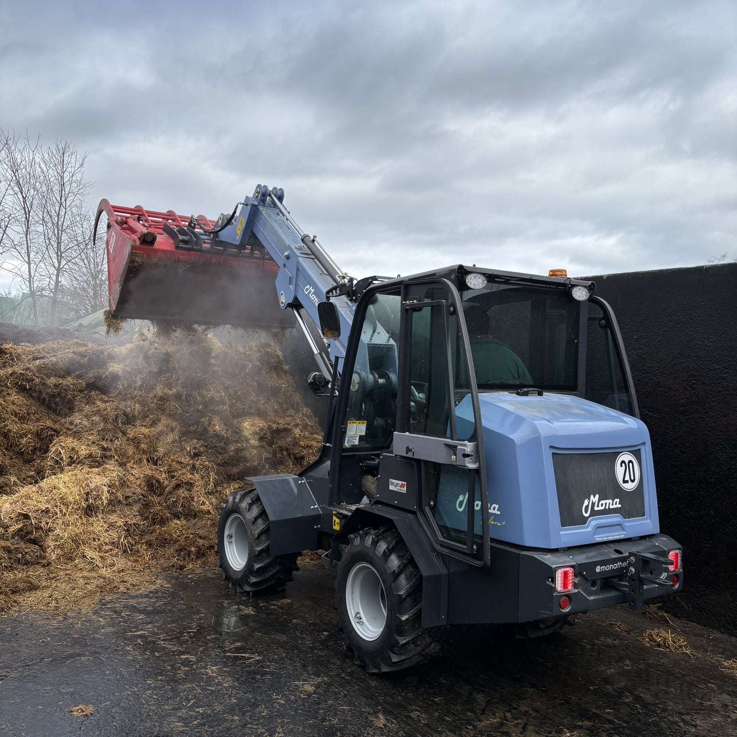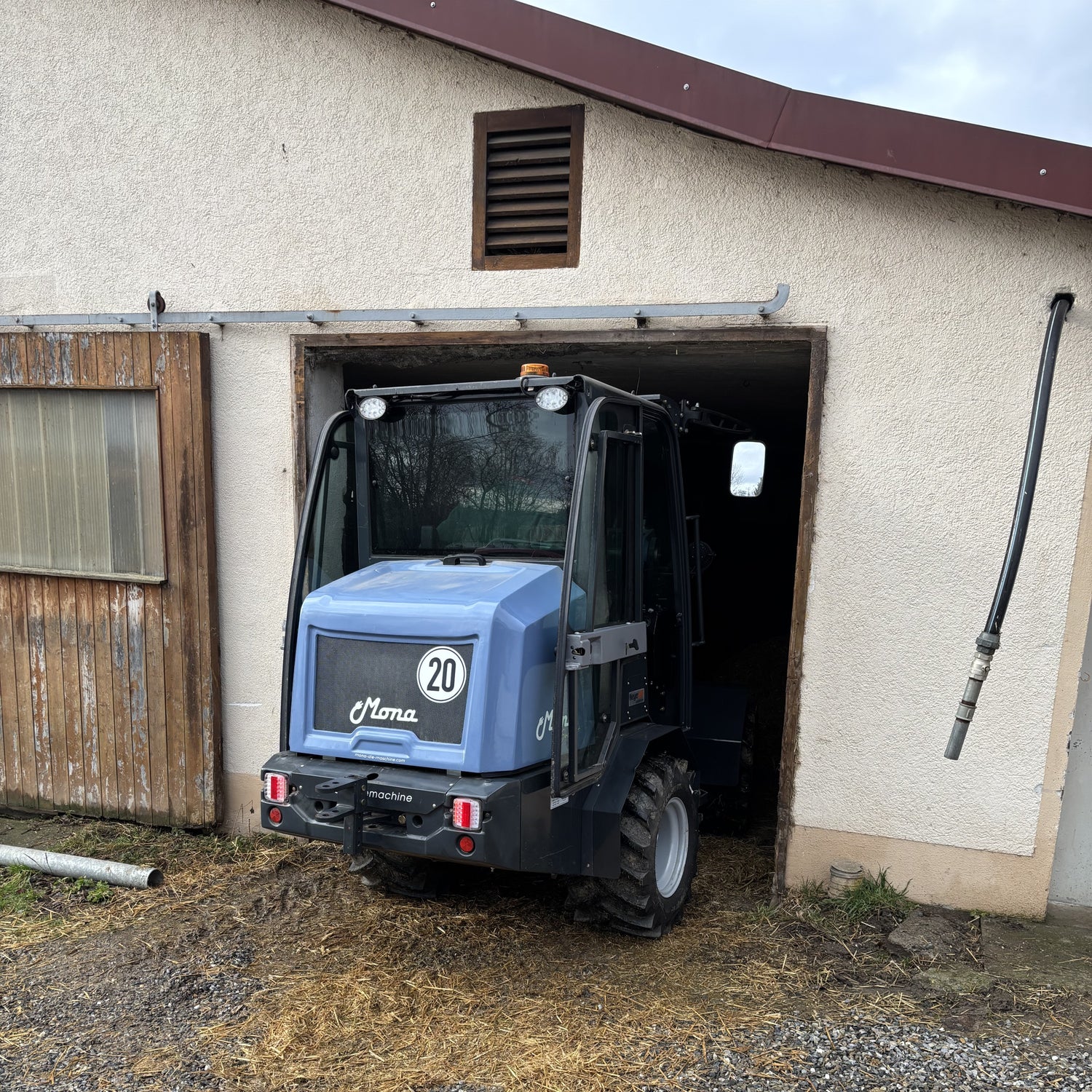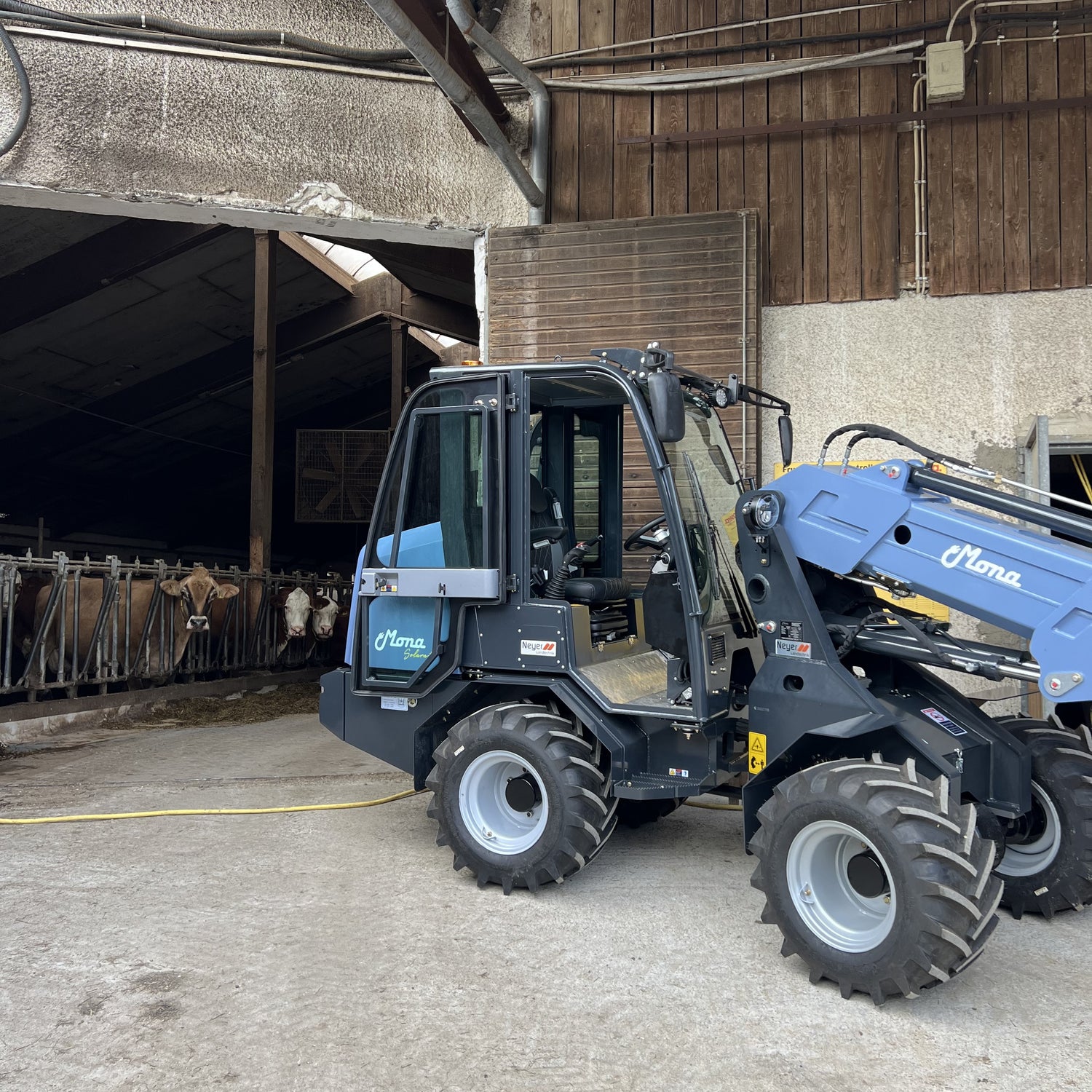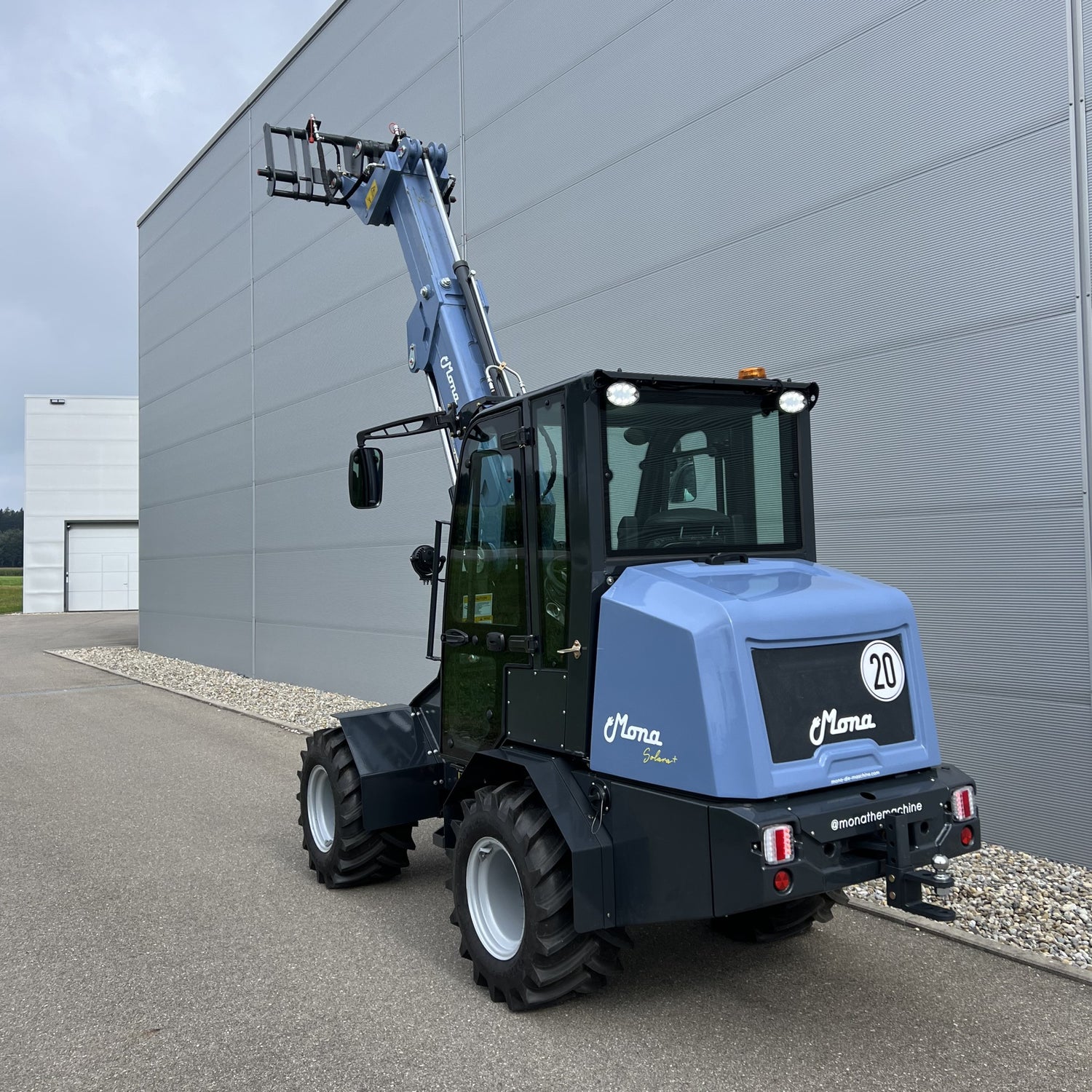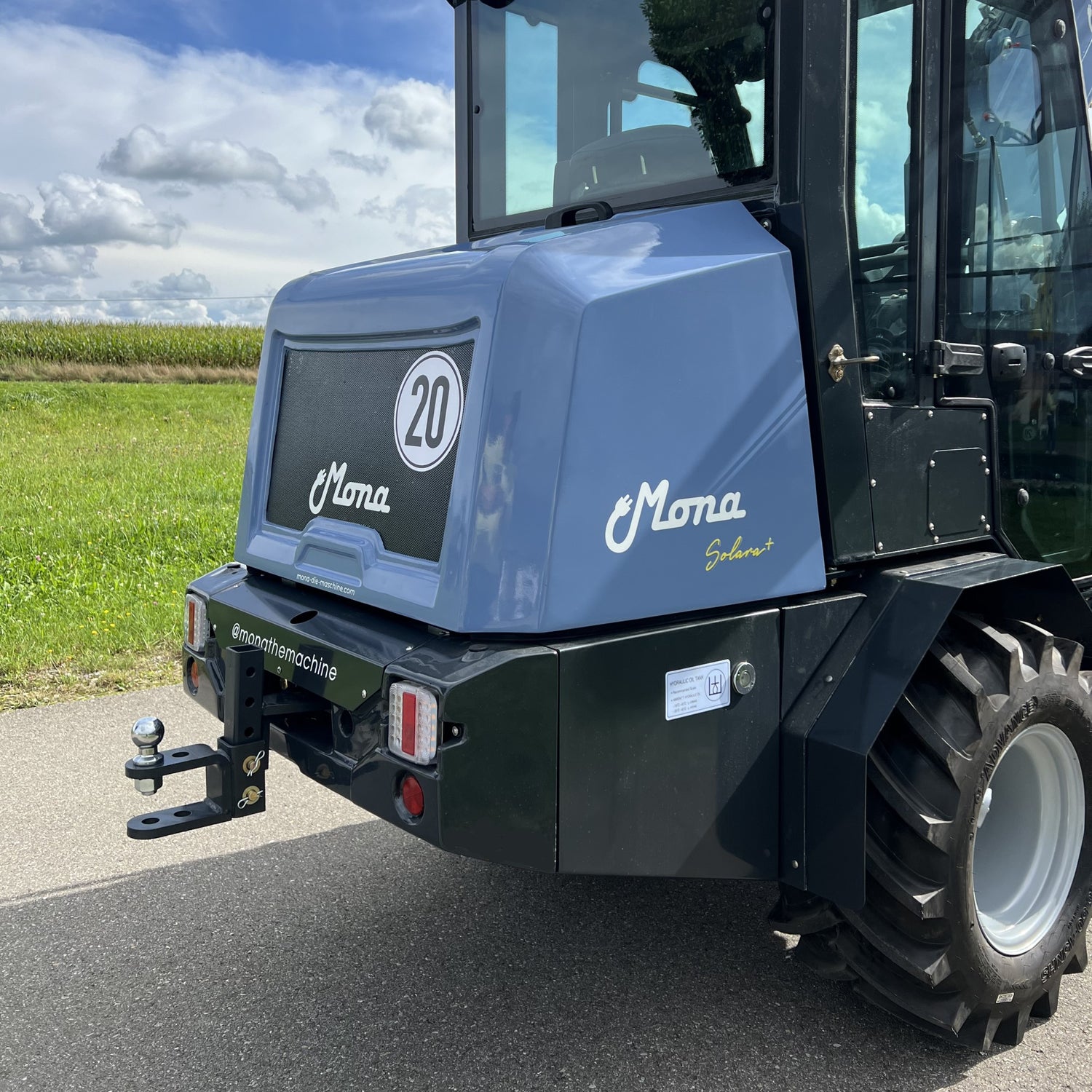 Der leistungsstarke MONA Solara+ Radlader mit Allrad und Kardanwelle wird mit einer 460 Ah (22 kWh) großen Lithium-Eisenphosphat Batterie bei 48 Volt betrieben.